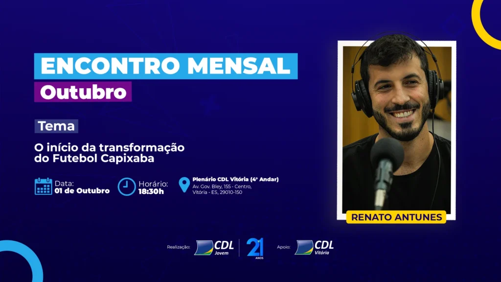 Vem aí o Encontro Mensal CDL Jovem de Outubro! Dessa vez, o papo vai ser sobre “O início da transformação do Futebol Capixaba”, com ninguém menos que Renato Antunes, CEO do Rio Branco SAF.