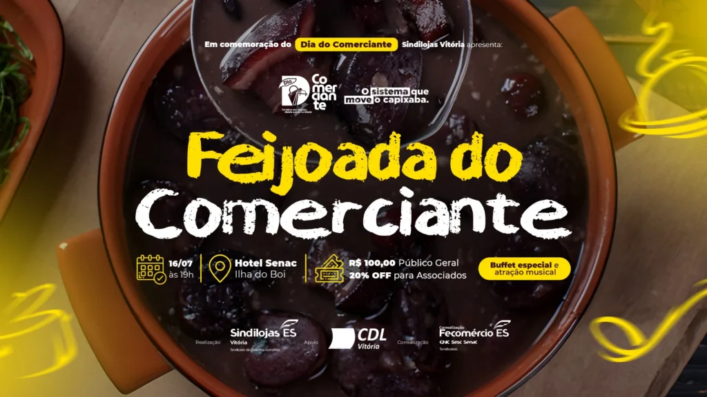 A Feijoada do Comerciante é uma realização do SindiLojas Vitória, com o apoio da CDL Vitória e correalização da Fecomércio-ES. Participe dessa celebração que tem sabor de conquista e gosto de gratidão. O evento é aberto ao público em geral e o valor por pessoa custa R$ 100. Associados ao Sindilojas Vitória ou à CDL Vitória têm 20% de desconto.